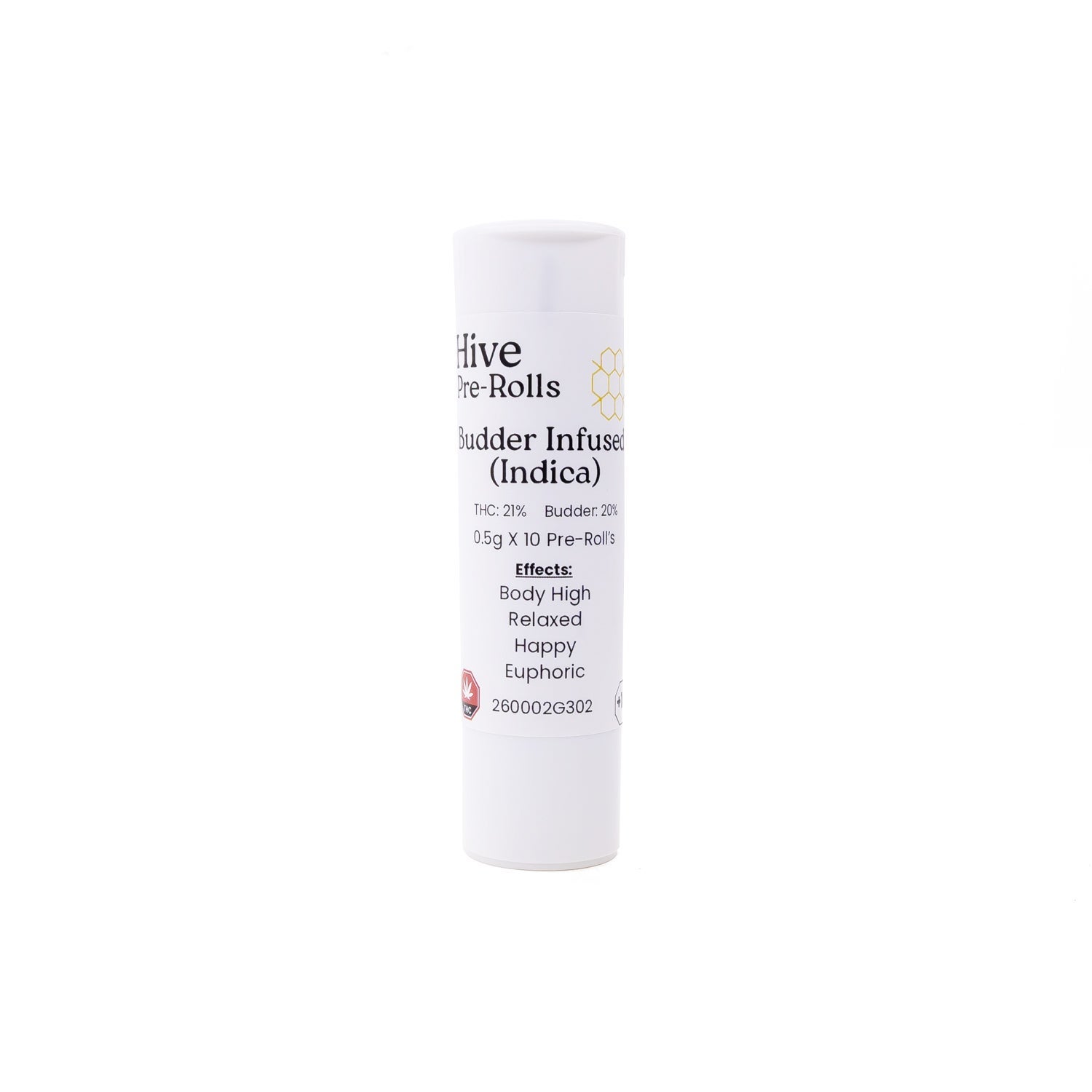 Introducing Hive Budder Infused Pre-Rolls: A pack of 10 perfectly rolled joints, each containing 0.5 grams of premium cannabis infused with high-quality budder, for a total of 5 grams per container. Crafted with a potent blend of AA to AAA grade flower, these pre-rolls deliver a smooth burn, rich flavor, and full-bodied smoke that hits hard and lasts. Designed for both relaxation and enjoyment, they offer a consistent, elevated experience with every puff. Convenient, strong, and seriously satisfying. Perfect for any occasion!