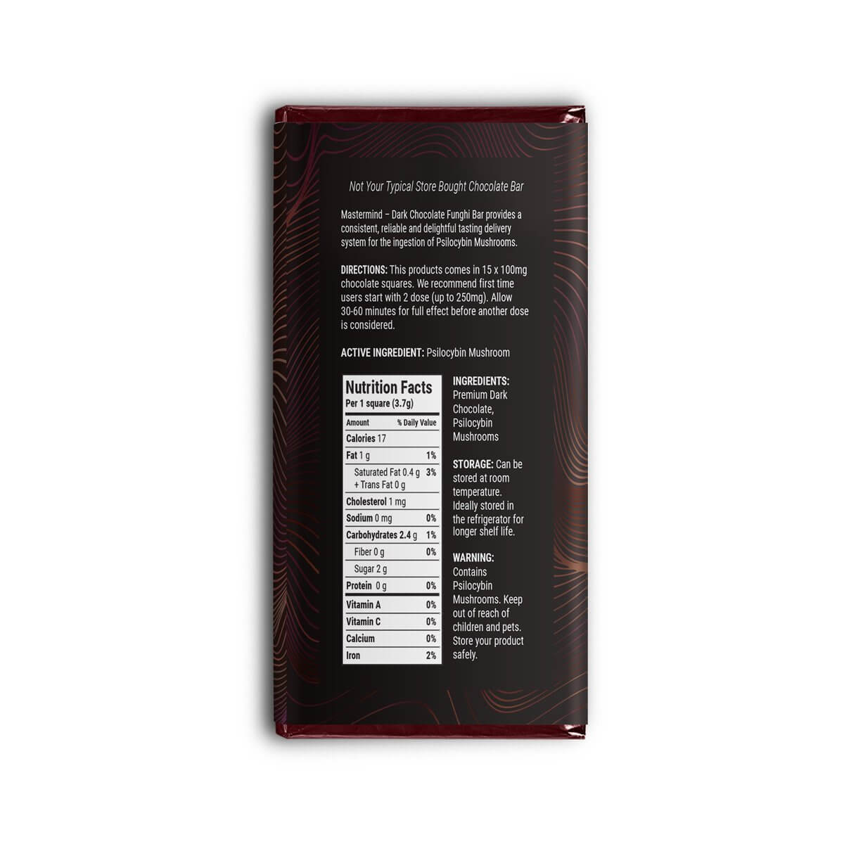 This one is for the Dark Chocolate lovers! The Mastermind 1500mg Dark Chocolate Bar provides an easy, consistent, reliable and tasty way to ingest your Magic Mushrooms. These bars contain 1500mg of our premium Psilocybe Cubensis blend and is distributed evenly in 15 x 100mg square. For Dark Chocolate lovers looking to go on a magical journey, or microdose daily, the 1500mg Dark Chocolate Bar is a fan favorite!